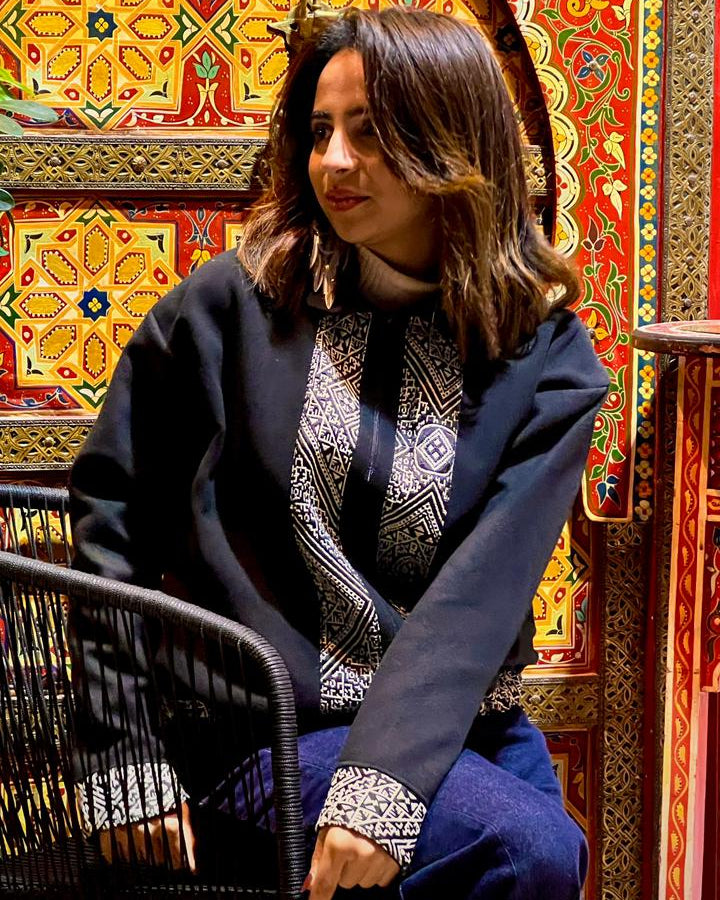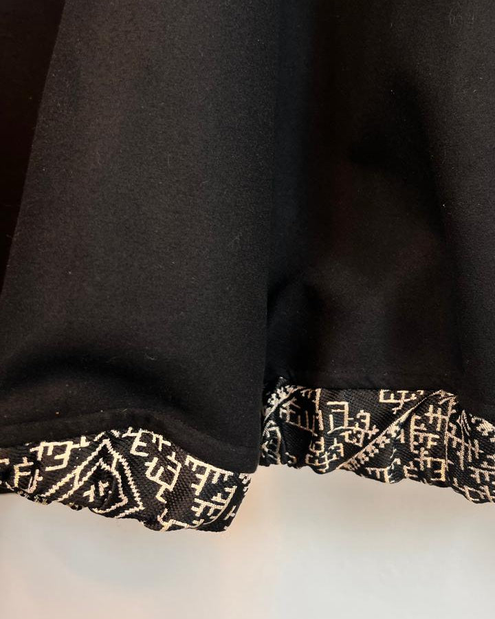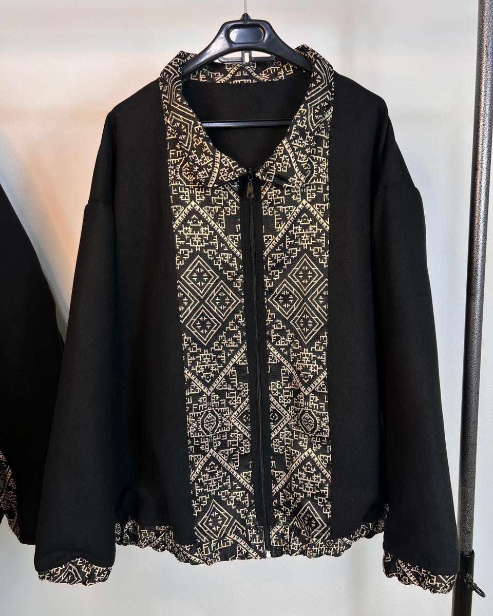 Ce bomber noir unisex allie style moderne et inspiration artisanale grâce à ses motifs géométriques traditionnels contrastés. Confectionné dans un tissu fluide et confortable, il offre une coupe oversize tendance avec fermeture zippée, col bomber, poignets et taille élastiqués pour un maintien parfait.