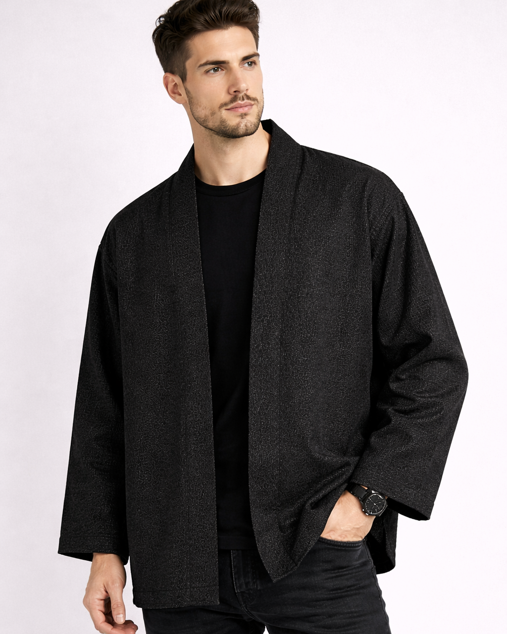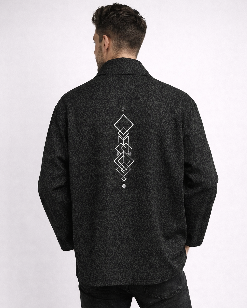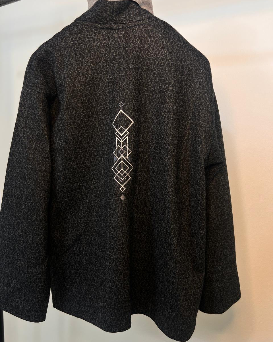 Kimono homme au design simple et moderne, confectionné dans un tissu texturé de haute qualité. Sa coupe ample et fluide offre un confort optimal et une silhouette élégante. Le devant est épuré avec une ouverture droite, tandis que la broderie géométrique discrète au dos apporte une touche artisanale et identitaire