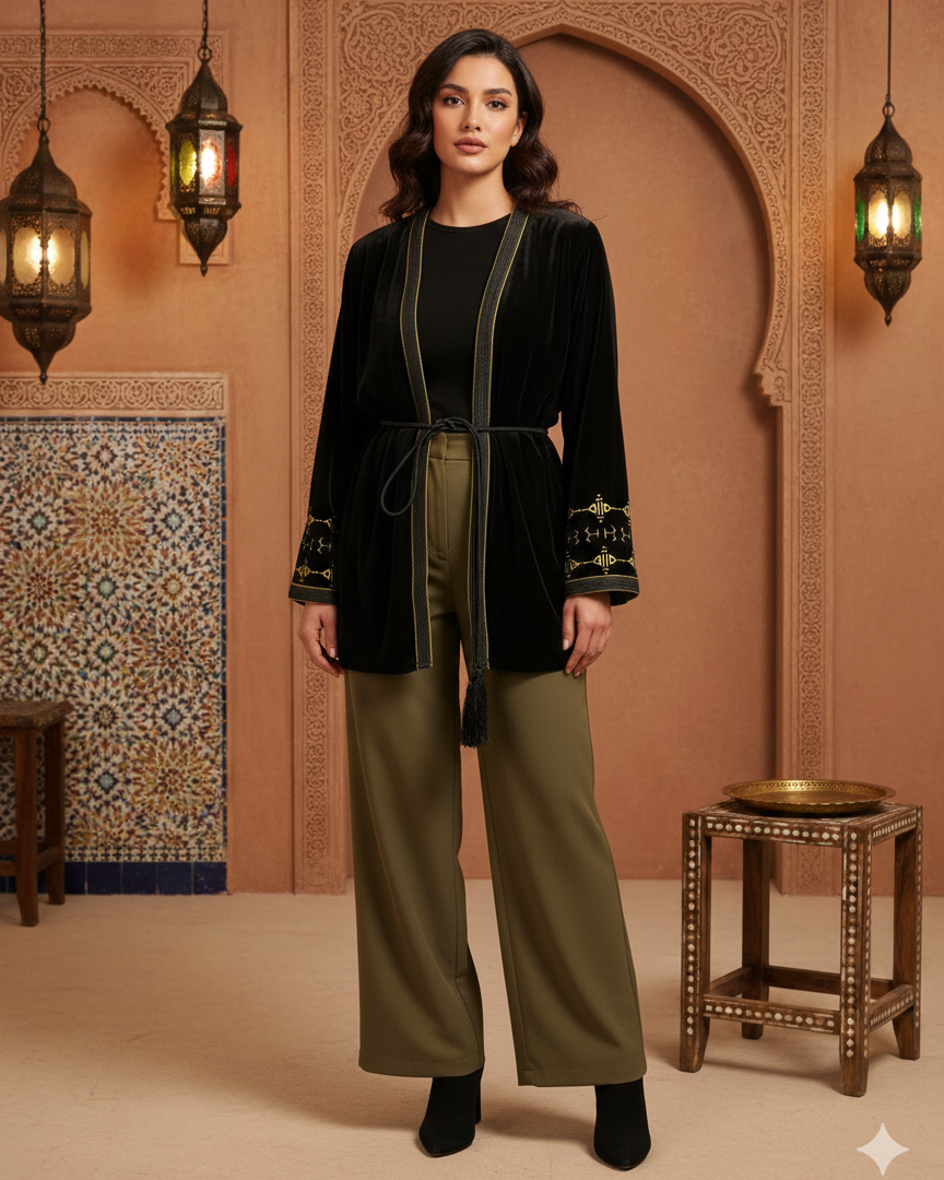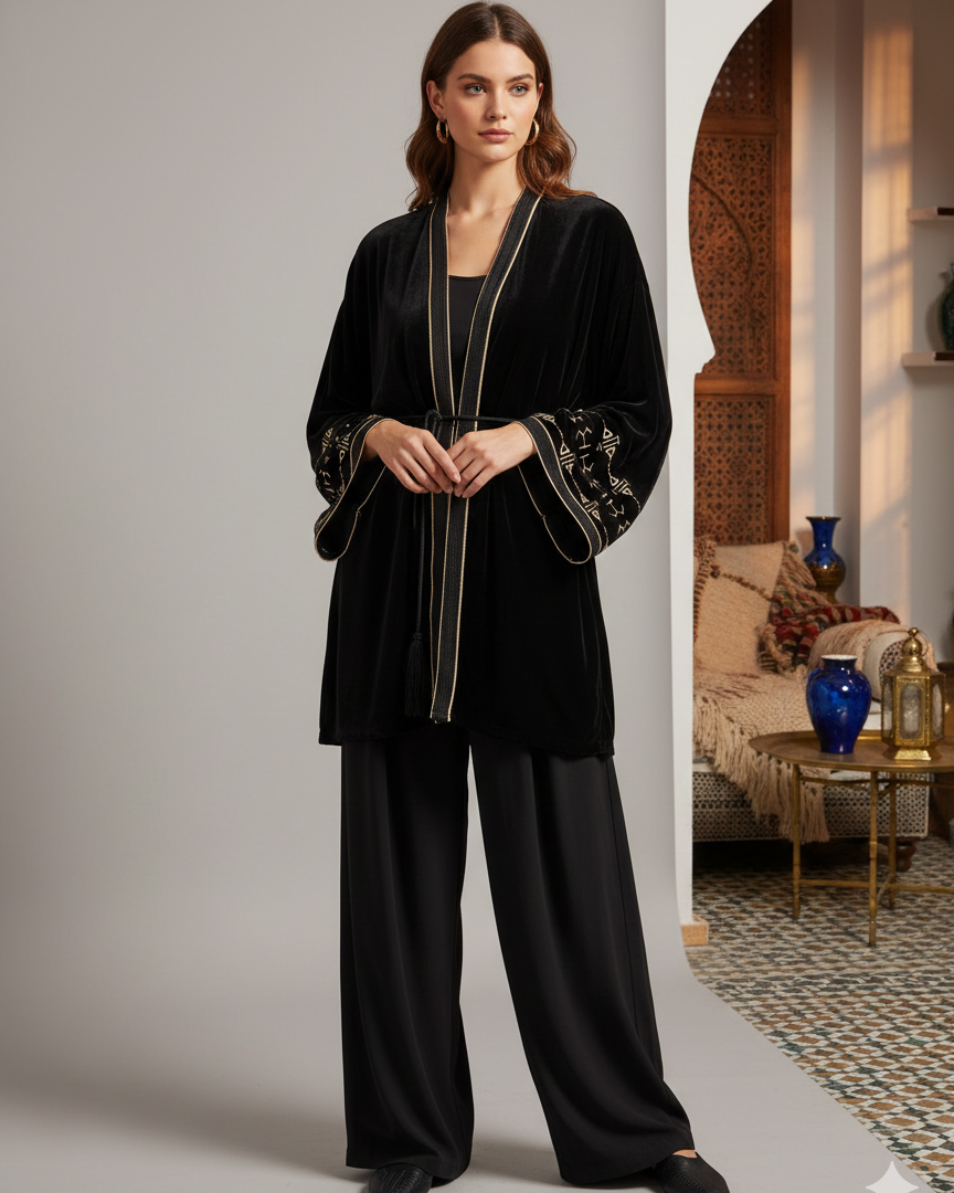 Short kimono en velours, une pièce exclusive qui fusionne l'héritage de l'artisanat marocain et les tendances de la mode contemporaine. Conçu dans un velours de soie haut de gamme, ce kimono court est l'alternative parfaite pour celles qui recherchent une silhouette à la fois noble et moderne.