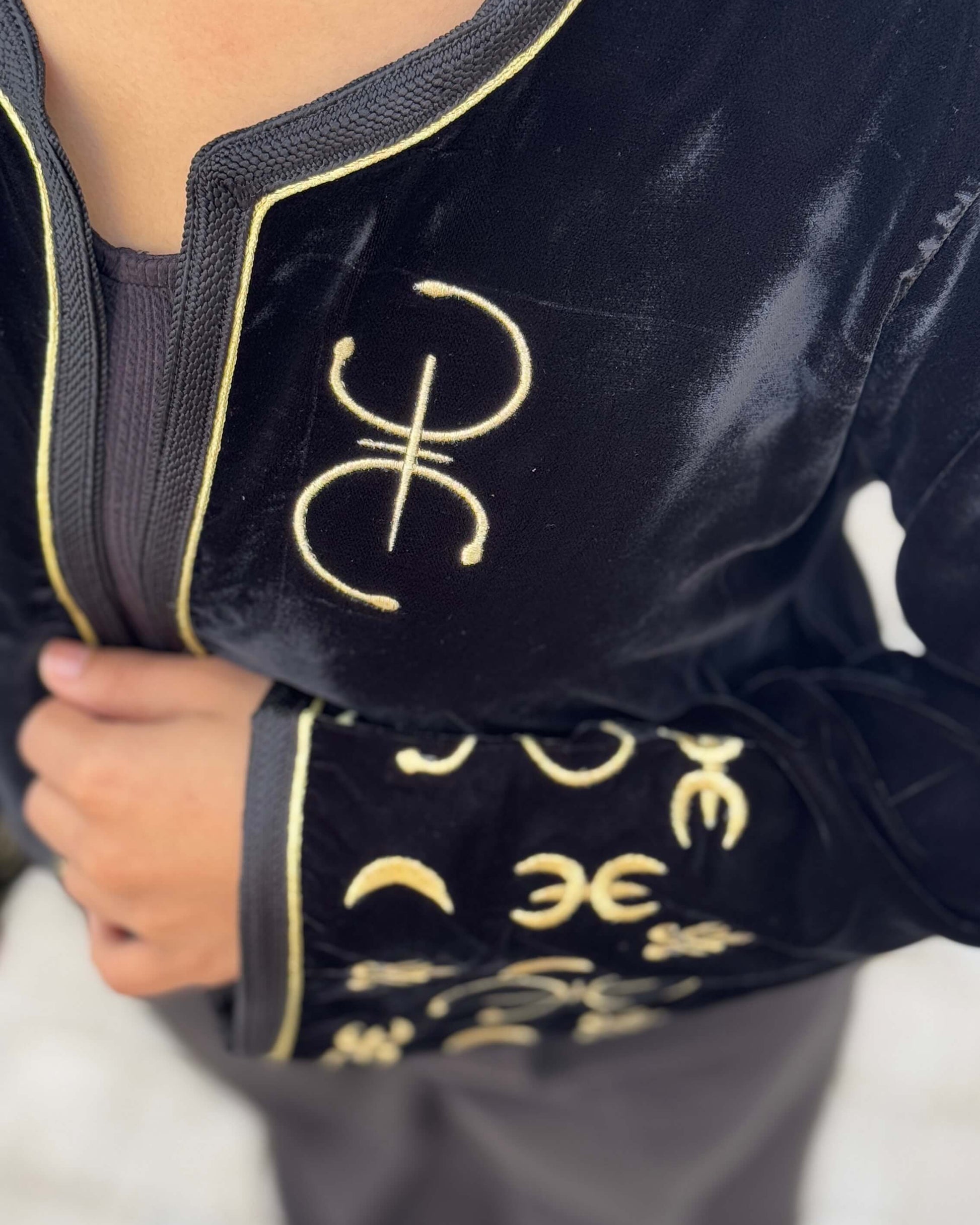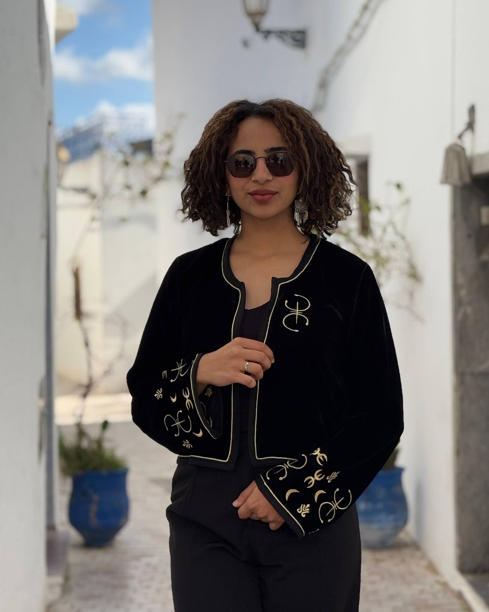 Veste Yaz inspirée du symbole Aza (ⵣ), lettre emblématique de l'alphabet tifinagh. Une pièce forte, portée comme une déclaration d'appartenance à la culture amazighe. Coupe structurée, finitions soignées, fabriquée au Maroc.